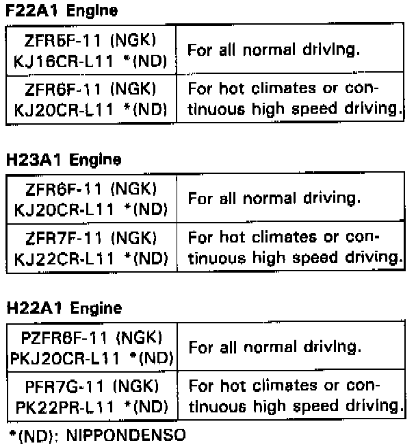 H22A1 engine: Make sure that the 1.3 mm (0.051 in) plug gauge does not go into the gap for the platinum tip plug. If the gauge goes into the gap, do not attempt to adjust the side electrode; replace the plug with a new one.