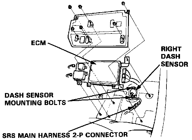 4. Right Dash Sensor: Remove the right door sill molding and pull back the carpet. Remove the ECM.