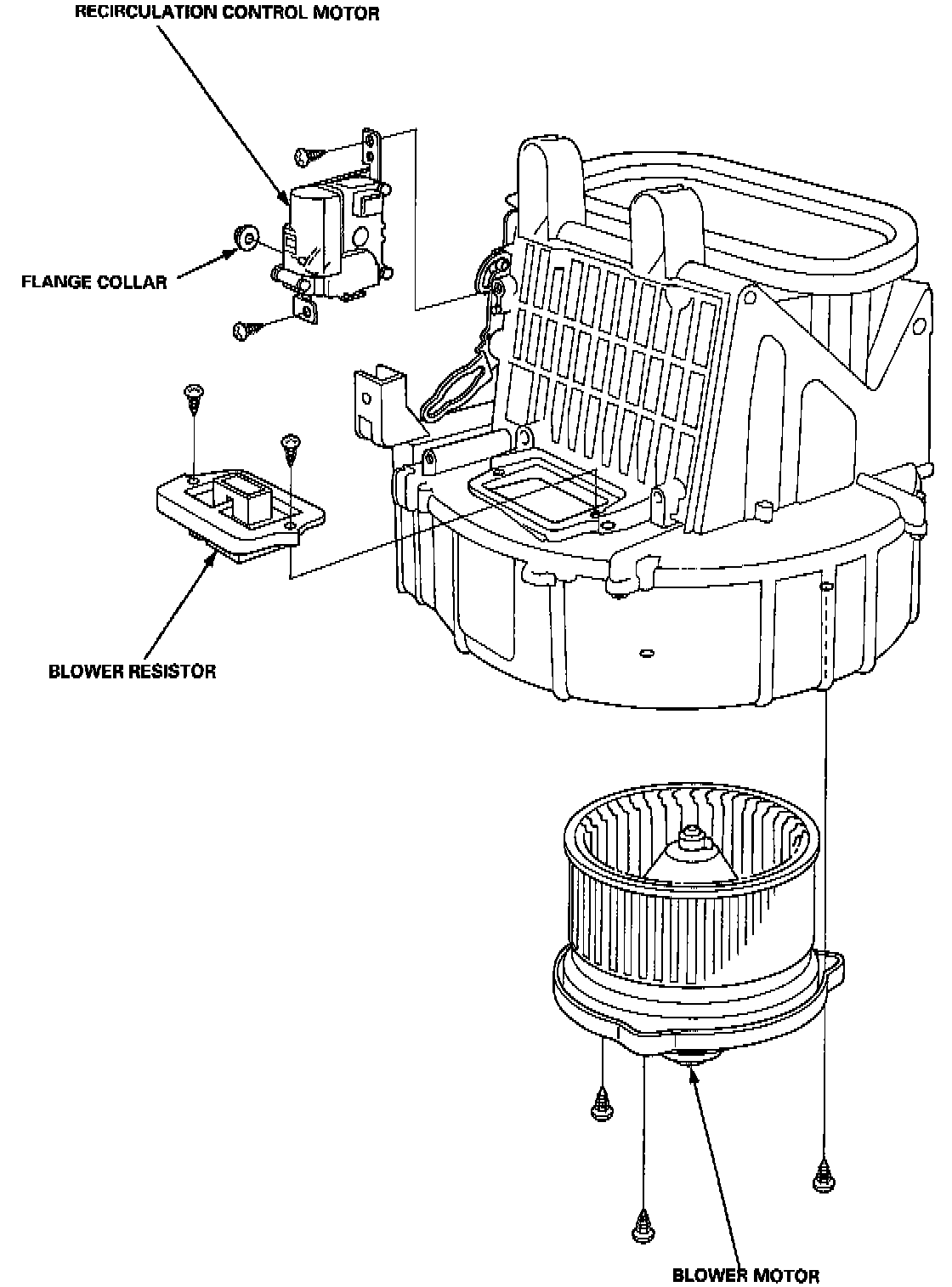 The blower motor, recirculation control motor and blower resistor can be replaced without removing the blower unit. Disconnect the connector from the blower motor, remove three mounting screws, remove blower motor. Reverse steps to install.