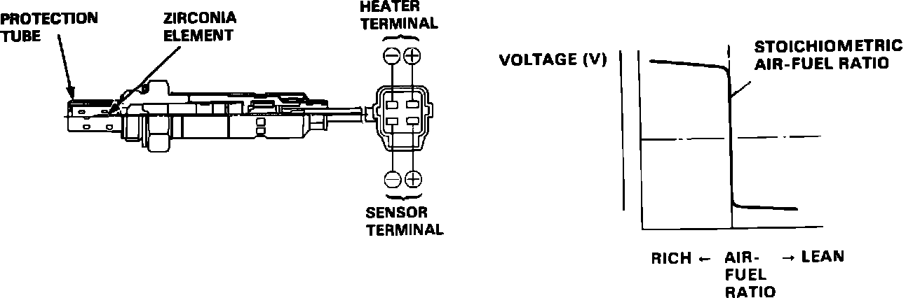 When heated by the combination of its internal heater and exhaust gases, the sensor supplies a low voltage signal (0 - 1 volt) to the ECM. When the engine is running rich, the oxygen differential is relatively high so signal voltage increases. When a lean condition occurs the difference in oxygen content is much lower causing a lower voltage signal to be produced.