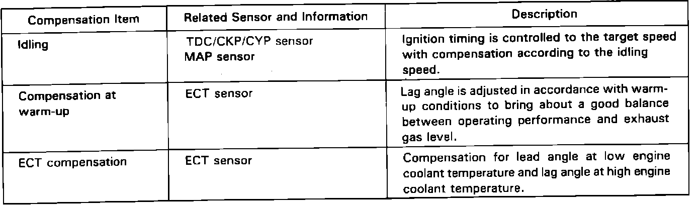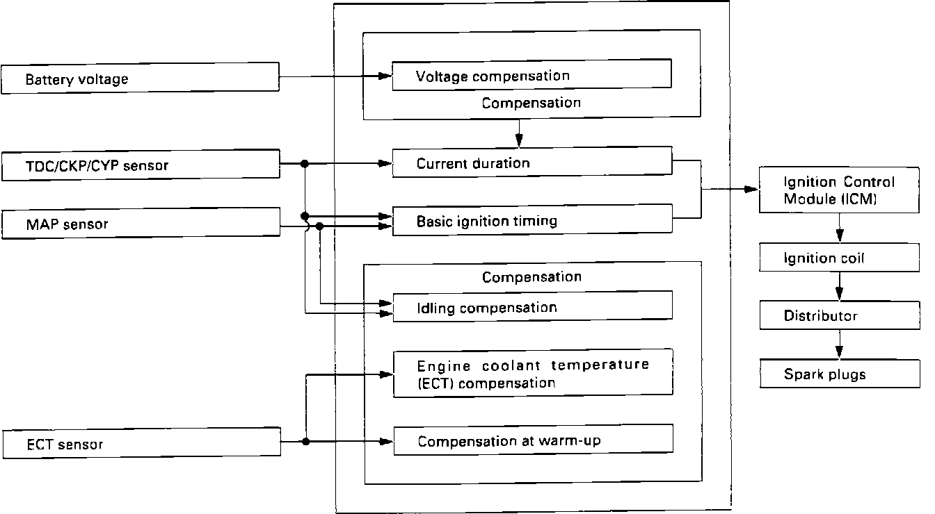 The Programmed Ignition (PGM-IG) used in this engine provides optimum control of ignition timing by using a microcomputer (ECM) that processes input signals from the Top Dead Center/Crankshaft Position/Cylinder Position (TDC/CKP/CYP) sensor, throttle angle sensor, coolant temperature sensor and MAP sensor to determine the correct ignition timing at any given driving condition.