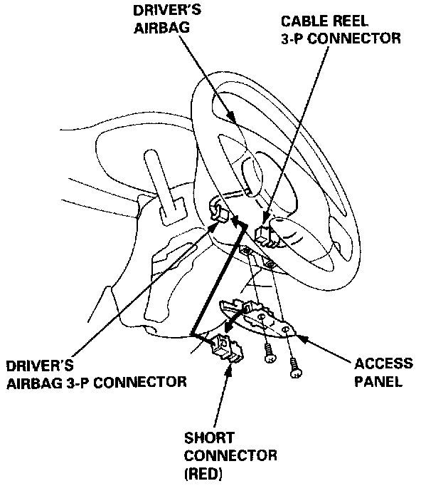 - Disconnect the 3-P connector between the driver's airbag and cable reel, then connect the short connector (RED) to the airbag side of the connector.