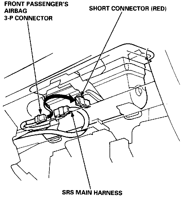 - Disconnect the 3-P connector between the front passenger's airbag and SRS main harness, then connect the short connector (RED) to the airbag side of the connector.