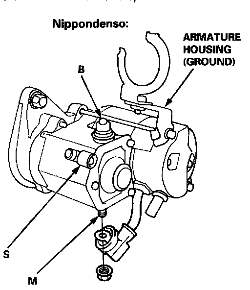 1. Check the hold-in coil for continuity between the S terminal and the armature housing (ground). The coil is OK if there is continuity.