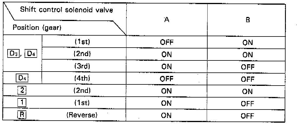 From sensor input signals, the PCM determines whether to turn the lock-up ON or OFF and activates lock-up control solenoid valve A and/or B accordingly. The combination of driving signals to lock-up control solenoid valves A and B is shown in the table.