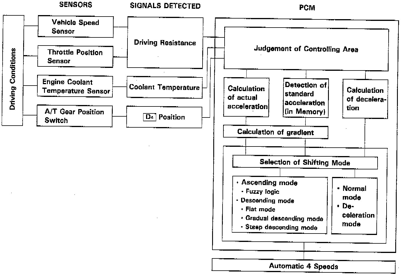 How it works: The PCM compares actual driving conditions with driving conditions memorized in the PCM, based on the input from the vehicle speed sensor, throttle position sensor, engine coolant temperature sensor, brake switch signal and shift lever position signal, to control shifting while a vehicle is ascending or descending a slope, or reducing speed.