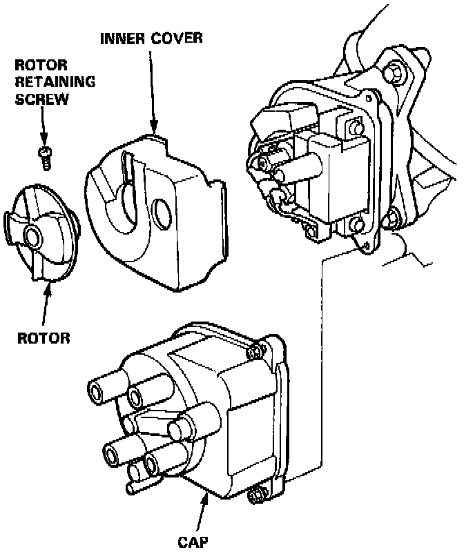 1. With the Ignition Switch OFF, remove the Distributor Cap and Rotor, then remove the inner cover.
