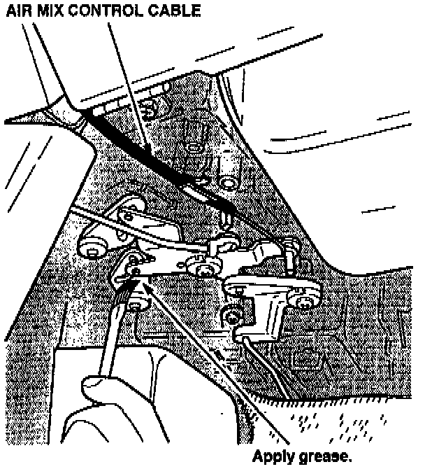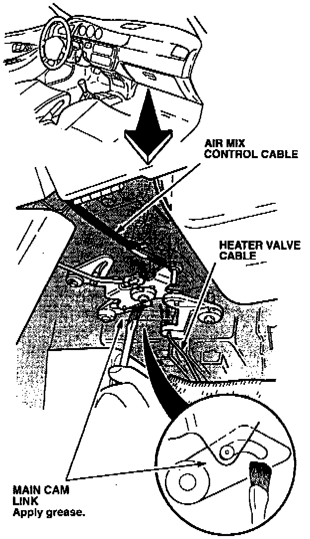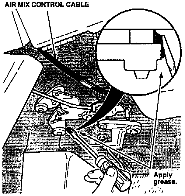 Japan-produced cars: Lubricate the groove and shaft on the main cam link with the grease listed under REQUIRED MATERIALS. Replace the air mix control cable if it is bent.