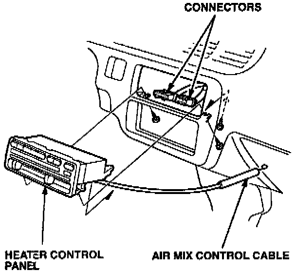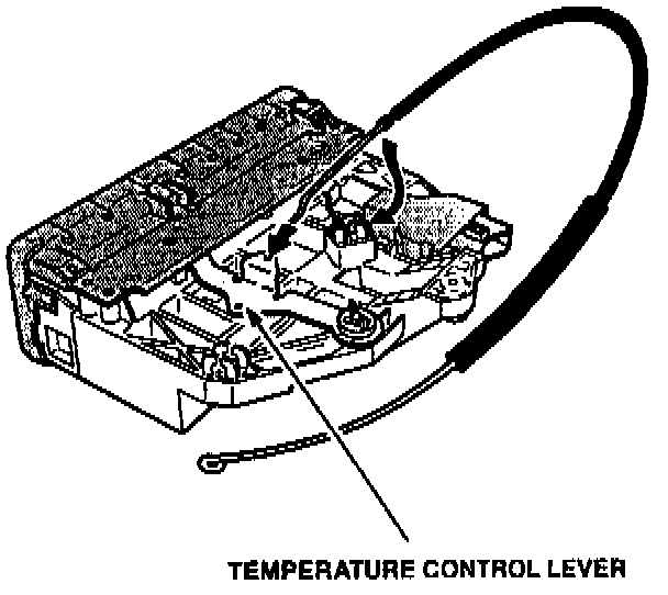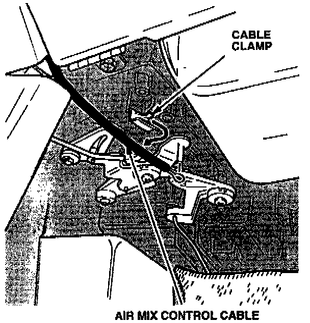 . Cut the air mix control cable at the temperature control lever. Disconnect the cut end of the cable from the lever. Pull the remaining pan of the cable out of its housing.