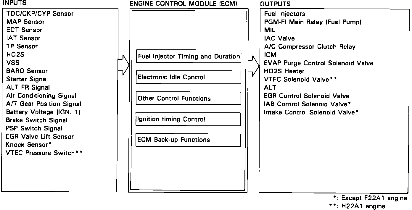 The PGM-FI ECM compares input signals with those stored in memory to determine what steps should be taken to achieve maximum performance, fuel economy, and meet emission standards. The PGM-FI ECM outputs the necessary signals to the fuel system, ignition system, air control system, and the emission control systems.