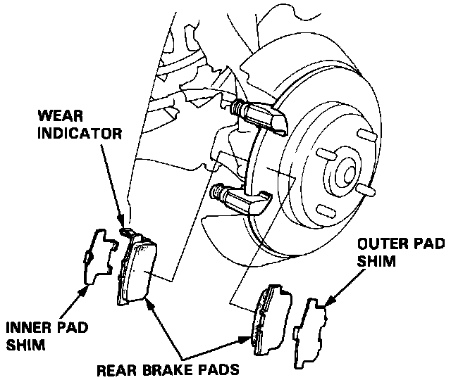 5. Using vernier calipers, measure the thickness of each brake pad lining. If lining thickness is less than service limit, replace the rear pads as a set.