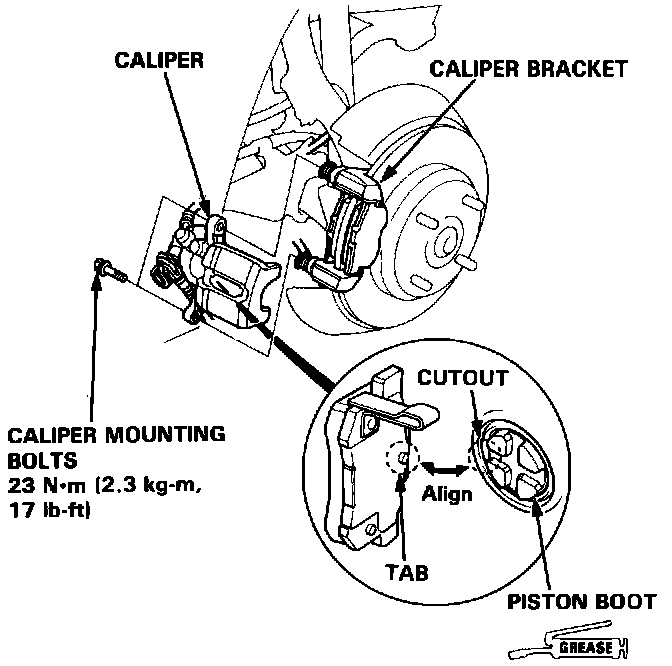 10. Install the caliper on the caliper bracket and tighten the caliper mounting bolts.