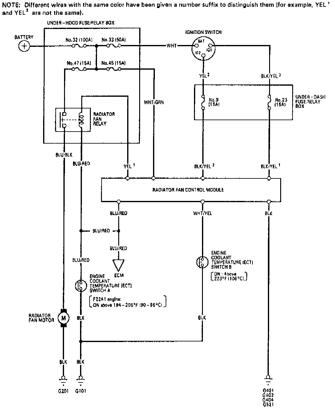 3. Cooling fan should begin to operate when coolant temperature reaches approximately 191-197°F. Fan should stop running when coolant temperature drops to approximately 182-188°F. When coolant temperature is above approximately 220°F, the condenser fan runs until the coolant temperature drops to approximately 214°F.