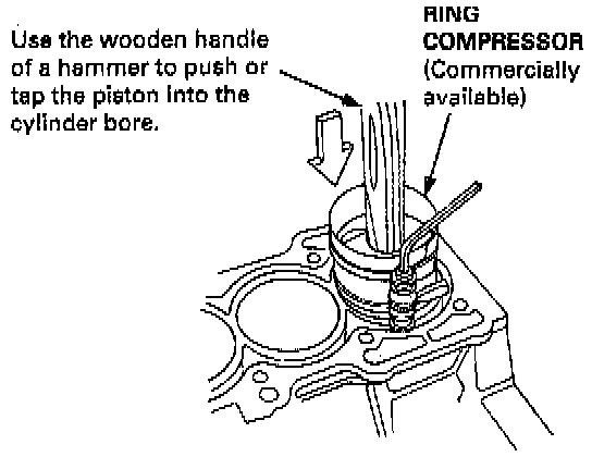 - Remove the rod caps and bearings, install the ring compressor, then position the piston in the cylinder and tap it in using the wooden handle of a hammer.