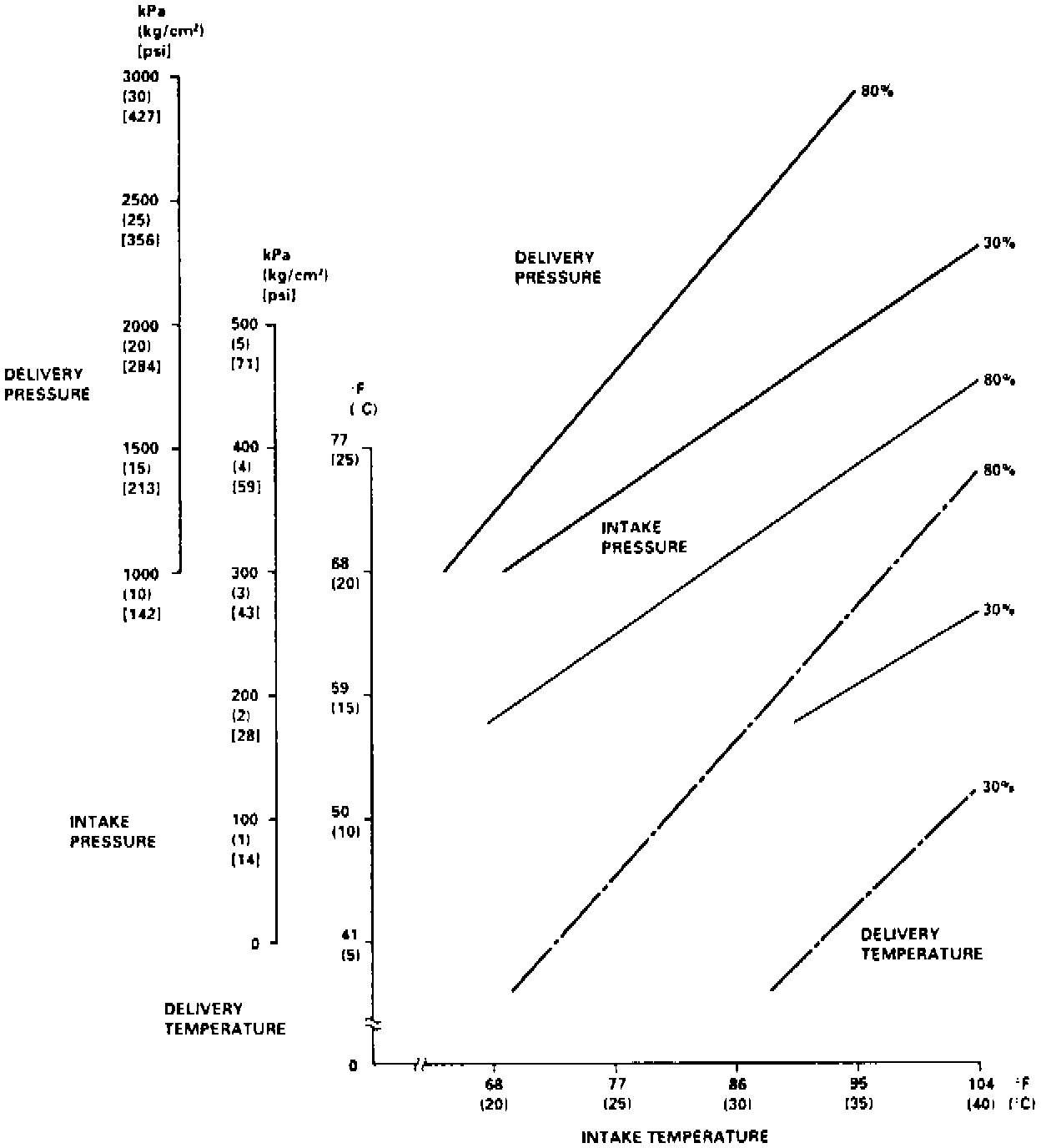 4. Using appropriate chart, Fig. 9, mark delivery temperature along vertical line, then intake temperature (ambient air temperature) along bottom line.