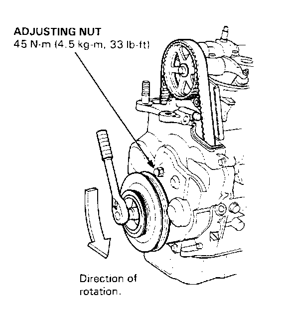 5. Rotate the crankshaft counterclockwise 3 teeth on the camshaft pulley, then reloosen the adjusting nut to create tension on the timing belt.
