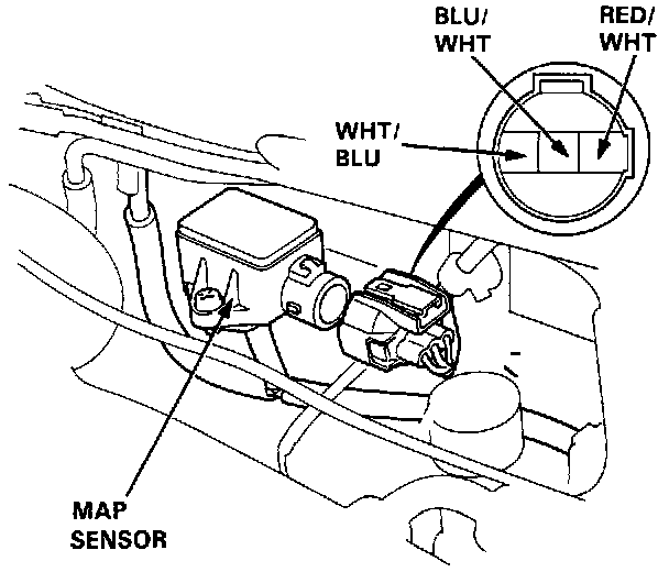 1. Turn ignition switch off. Disconnect the three pin connector from the MAP sensor. Turn ignition on.