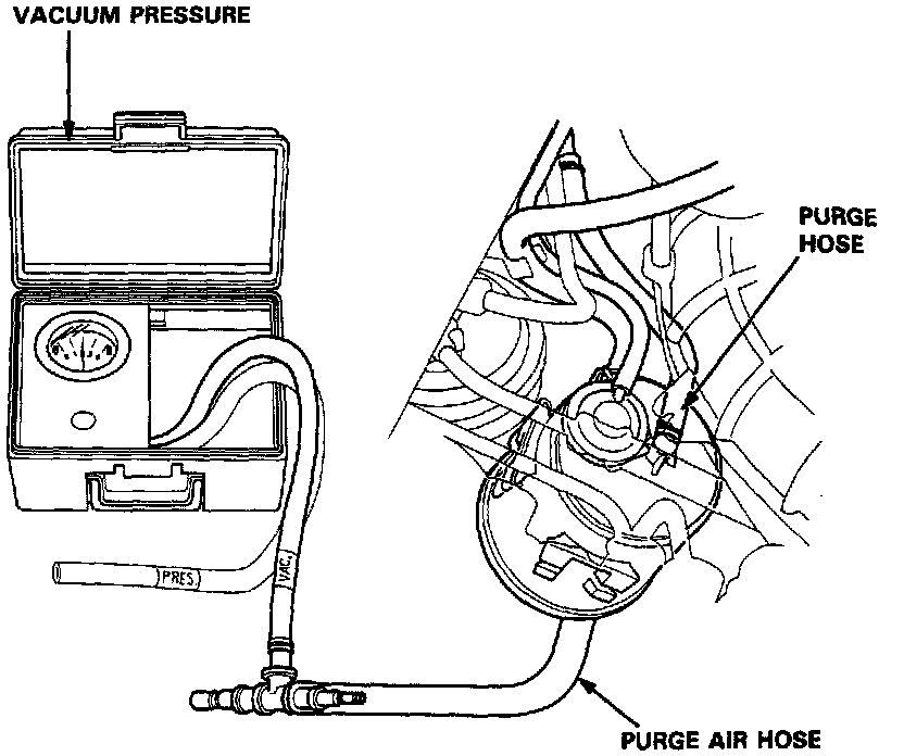 6. Connect a vacuum gauge to EVAP Purge Control Canister Purge Air Hose. Start engine and raise speed to 3500 rpm. Vacuum should appear at gauge after approx. one minute. If no vacuum appears: