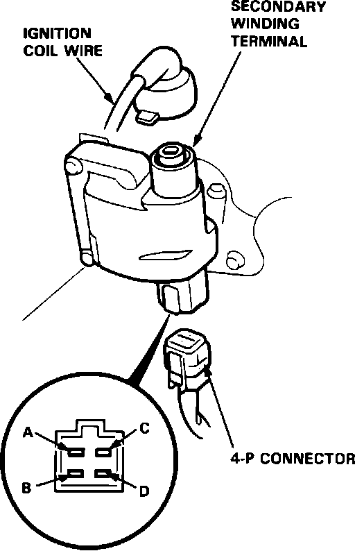 The primary winding is connected directly to the ignition switch (+) and ignition control module (-). The secondary winding is connected to the coil output tower through the iron core.