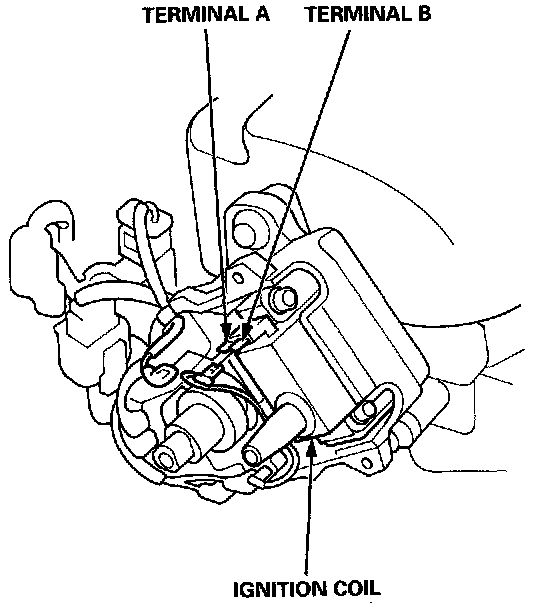1. Turn the Ignition Switch "OFF", and remove the Distributor Ignition Cap.2. Remove the two screws to disconnect the BLK/YEL and BLU2 Wires from Terminals A (+) and B (-) respectively.