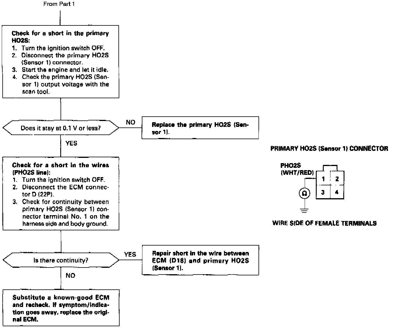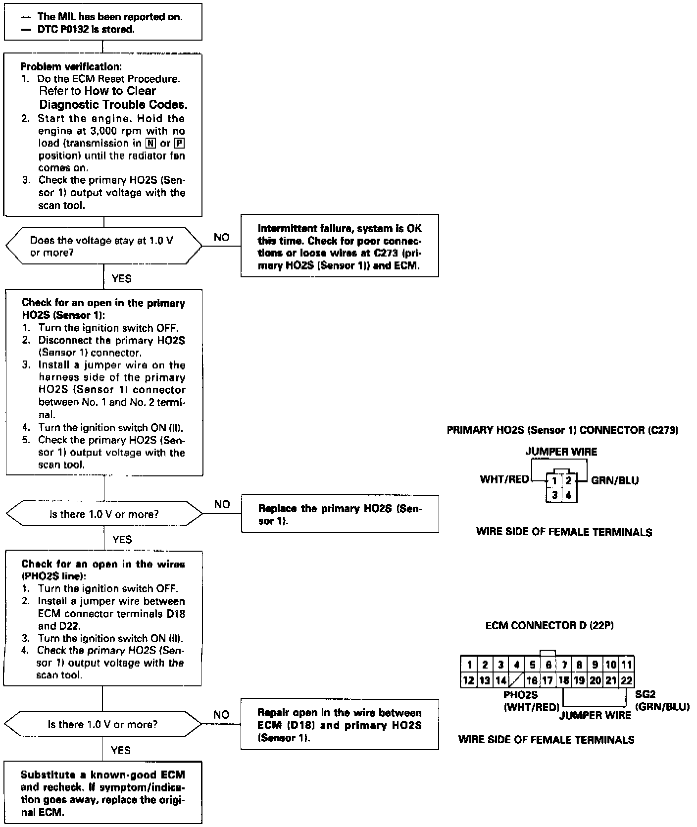 [P0132] The scan tool indicates Diagnostic Trouble Code (DTC) PO132: A high voltage problem in the Primary Heated Oxygen Sensor (Primary HO2S) (Sensor 1) circuit.