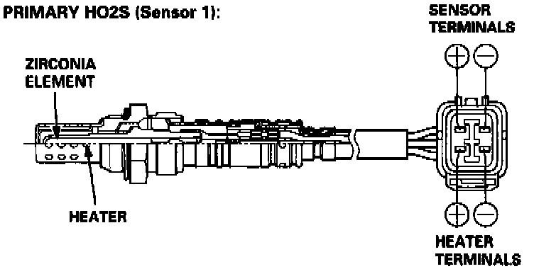 The Heated Oxygen Sensor (HO2S) detects the oxygen content in the exhaust gas and signals the ECM. In operation, the ECM receives the signals from the sensor and varies the duration during which fuel is injected. To stabilize the sensor's output, the sensor has an internal heater.