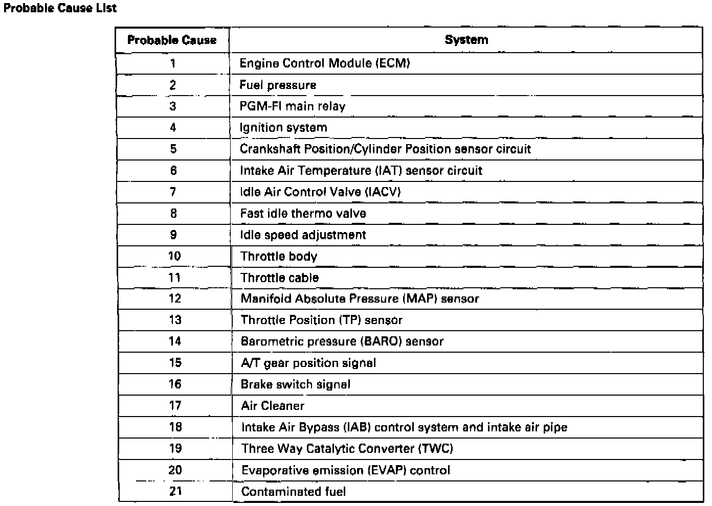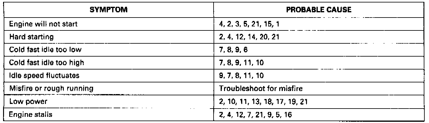 Listed above are symptoms and probable causes for problems that DO NOT cause the Malfunction Indicator Lamp (MIL) to come on. If the MIL was reported on, go to Troubleshooting Procedures.