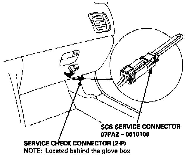 2. Pull out the service check connector located behind the glove box. Connect the GRN/BLU and RED terminals with the SCS service connector.