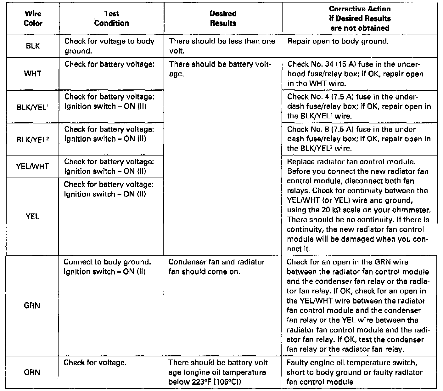 NOTE: Perform the following tests with the radiator fan control module connected and the ignition switch ON (II) and the A/C switch OFF.