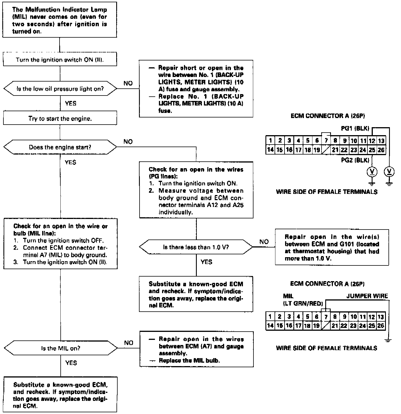 NOTE: If this symptom is intermittent, check for a loose fuse No. 1 (BACK UP LIGHTS, METER LIGHTS, 10 A) in the under-dash fuse/relay box, a poor connection at ECM terminal A7, or an intermittent open in the LT GRN/RED wire between the ECM (A7) and the gauge assembly.
