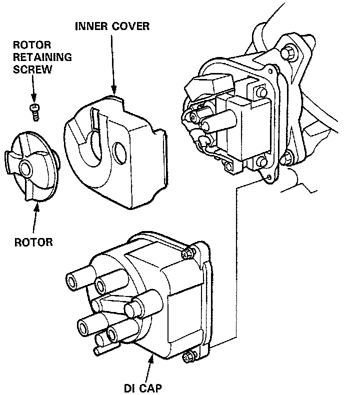 1. With the Ignition Switch "OFF", remove the Distributor Ignition (DI) Cap, Distributor Ignition Rotor and the Inner Cover.