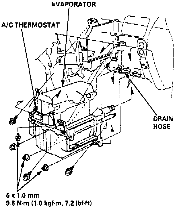 6. Disconnect electrical connector from A/C thermostat, then remove four screws, two mounting nuts and mounting bolt.