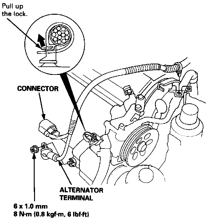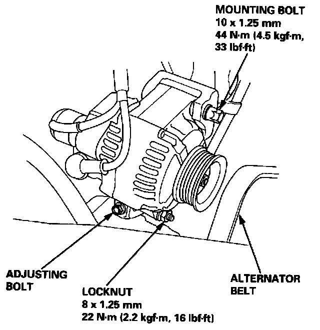 5. Loosen the adjusting bolt, mounting bolt and locknut, then remove the alternator belt.
