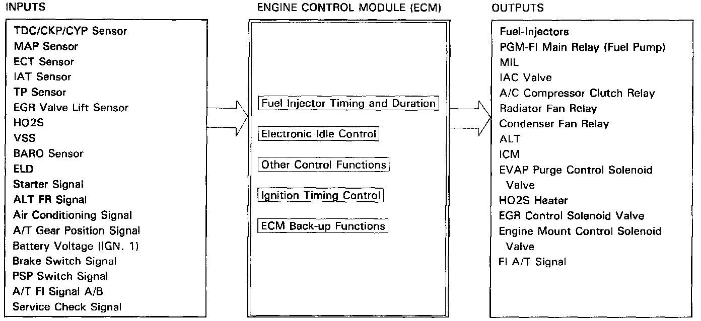 When the Ignition Switch is initially turned on, the ECM supplies ground to the PGM-FI Main Relay that supplies current to the Fuel Pump for two seconds to pressurize the Fuel system.