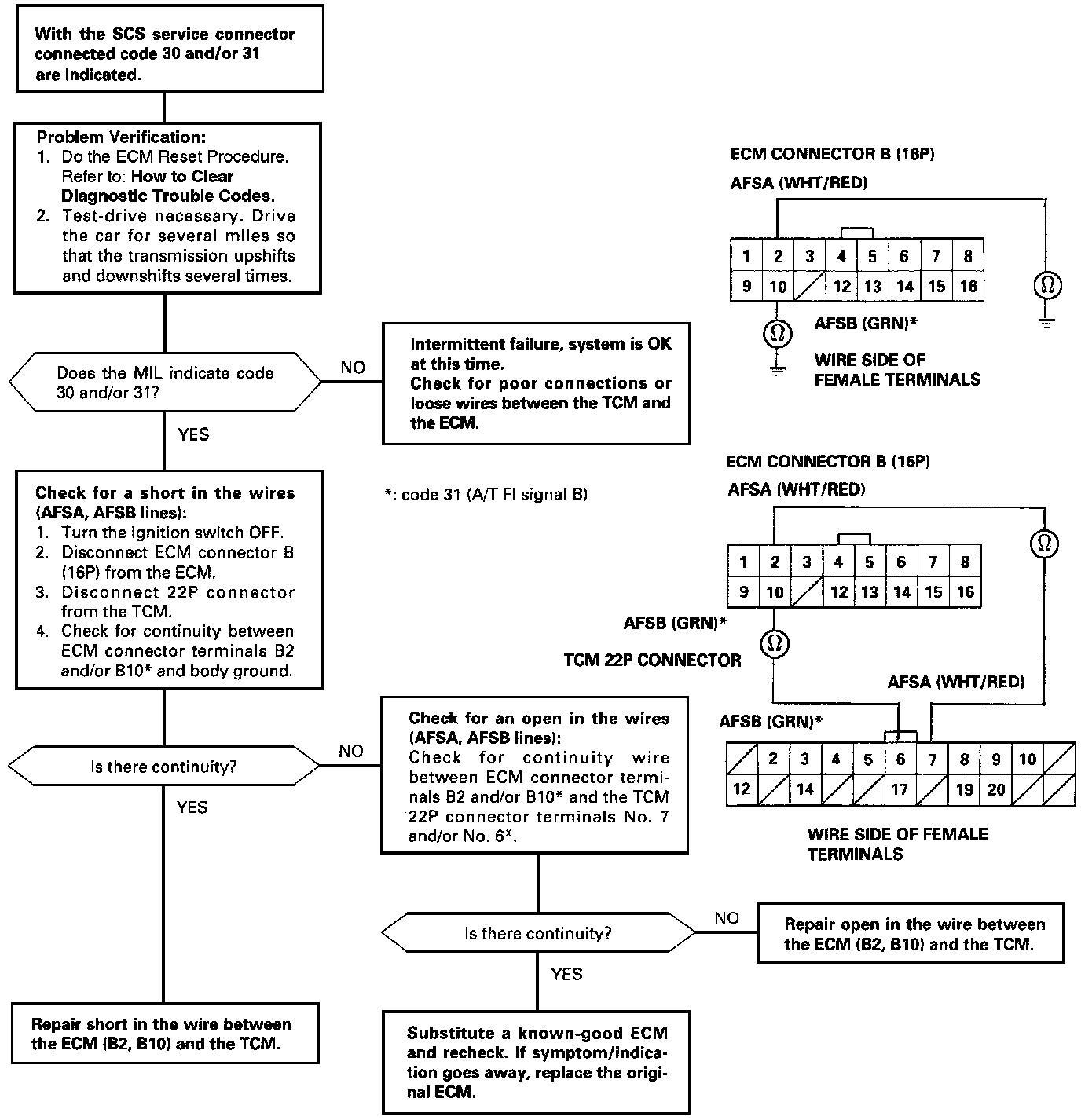 The Malfunction Indicator Lamp (MIL) indicates Diagnostic Trouble Code (DTC) 31 - A problem in the A/T FI Signal B circuit between Transmission Control Module (TCM) and ECM.