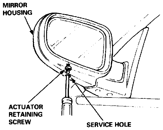 1. Insert a screwdriver in the mirror housing through the service hole, and loosen the actuator retaining screw.
