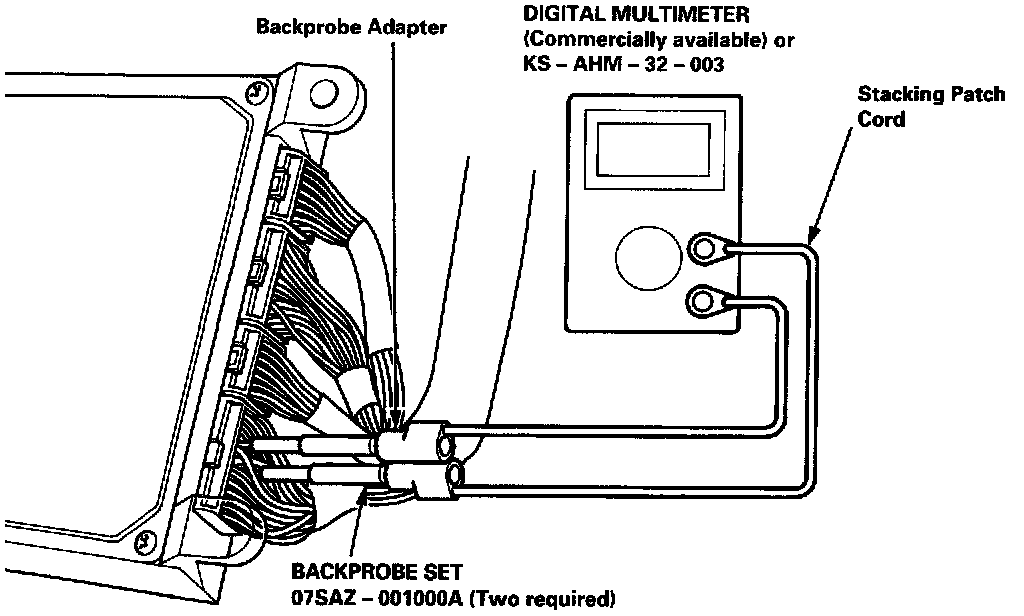If the inspection for a particular code requires voltage or resistance checks at the ECM/PCM connectors, remove the right door sill molding. Pull the carpet back to expose the ECM/PCM. Unbolt the ECM/PCM cover, and connect the backprobe sets and a digital multimeter as described below. Check the system according to the procedure described for the appropriate code(s). Refer to Diagnostic Charts/Trouble Code Charts.