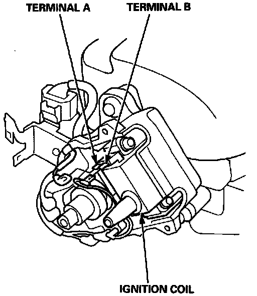 1. Turn the ignition switch OFF, and remove the distributor ignition (DI) cap.2. Remove the two screws to disconnect the BLK/VEL and WHT/BLK wires from terminals A (+) and B (-) respectively.