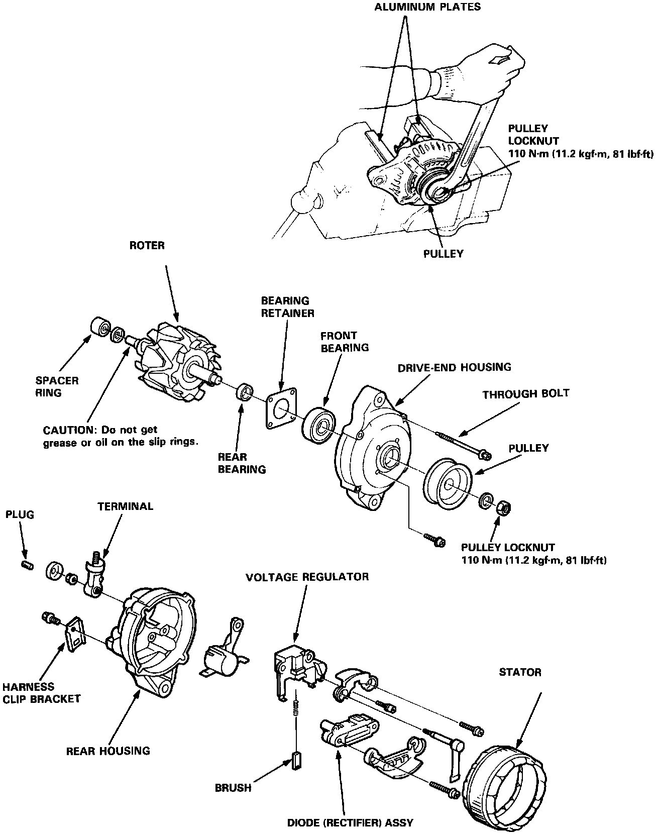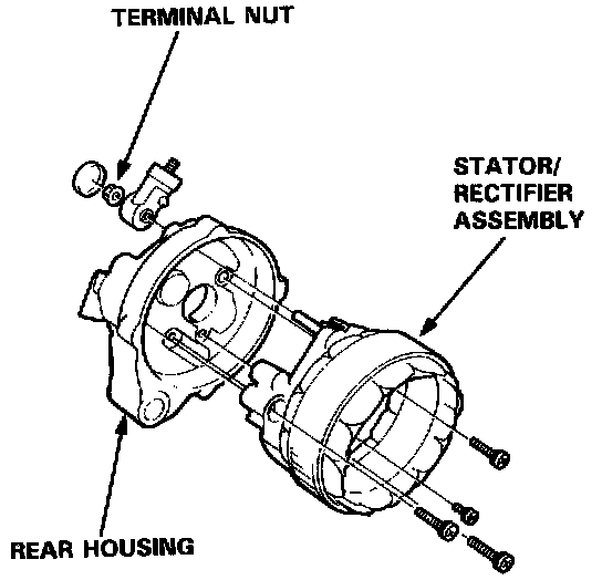 2. Separate the rear housing from the stator/rectifier assembly by removing the four screws and the terminal nut from the rear housing.