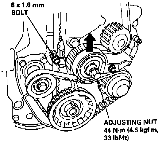 - Push the tensioner to remove tension from the timing balancer belt, then retighten the adjusting nut.