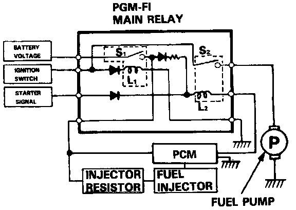 The PGM-FI main relay actually contains two individual relays. This relay is located at the left side of the cowl. One relay is energized whenever the ignition is on which supplies the battery voltage to the PCM, power to the fuel injectors, and power for the second relay. The second relay is energized for two seconds when the ignition is switched ON, and when the engine is running, to supply power to the fuel pump.