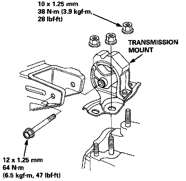 13. Install the transmission mount. Tighten the bolt loosely and tighten the nuts to the specified torque, then tighten the bolt to the specified torque.