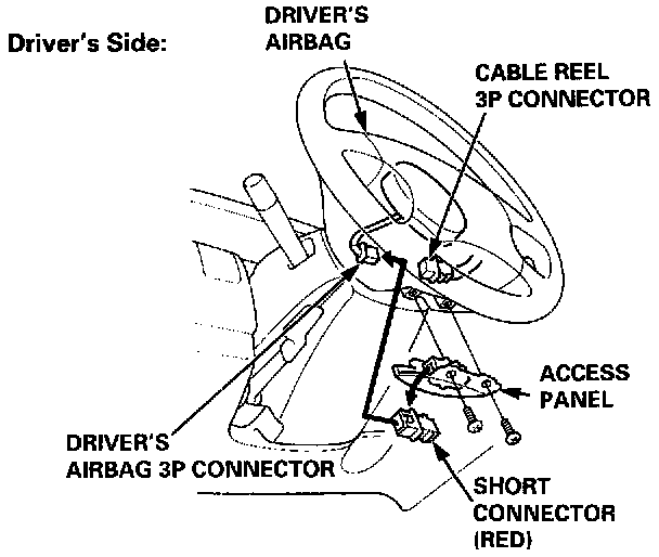 CAUTION:Before disconnecting any part of the SRS wire harness, disconnect the airbag connectors, and connect the short connector (RED) to the driver's airbag connector.