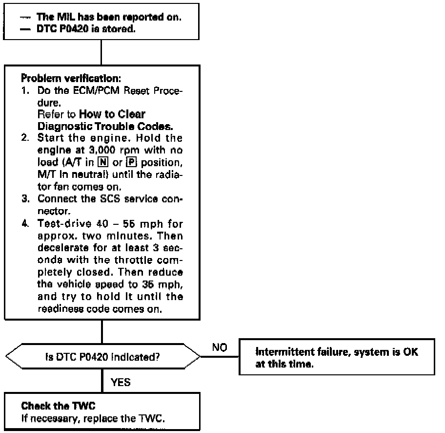 NOTE: If some of the DTCs listed below are stored at the same time as DTC P0420, troubleshoot those DTCs first, then troubleshoot DTC P0420.
