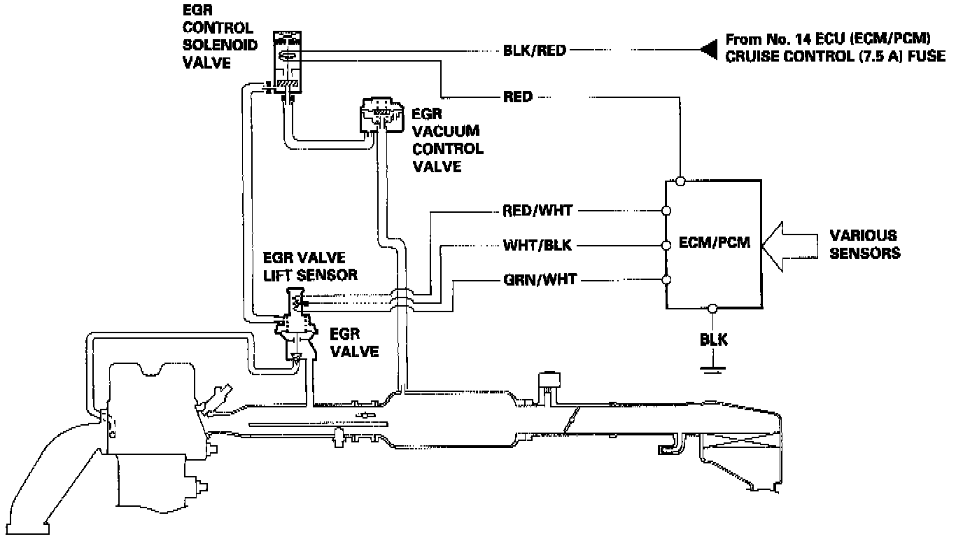 The ECM/PCM contains memories for ideal EGR valve lifts for varying operating conditions. The EGR valve lift sensor detects the amount of EGR valve lift and sends the information to the ECM/PCM. The ECM/PCM then compares it with the ideal EGR valve lift which is determined by signals sent from the other sensors. If there is any difference between the two, the ECM/PCM cuts current to the EGR control solenoid valve to reduce vacuum applied to the EGR valve.
