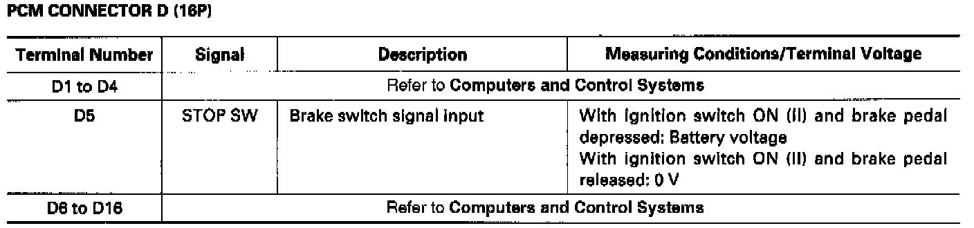 The PCM terminal voltage and measuring conditions are shown for the connector terminals that are related to the A/T control system. The other PCM terminal voltage and measuring conditions are described in Normal Scan Data Values under Computers and Control Systems. Testing and Inspection