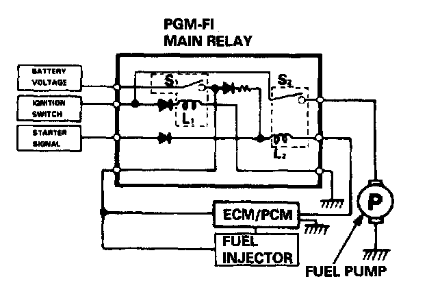 The PGM-FI main relay actually contains two individual relays. This relay is located at the passenger side of the cowl. One relay is energized whenever the ignition is on which supplies the battery voltage to the ECM/PCM, power to the fuel injectors, and power for the second relay. The second relay is energized for two seconds when the ignition is switched on, and when the engine is running, to supply power to the fuel pump.