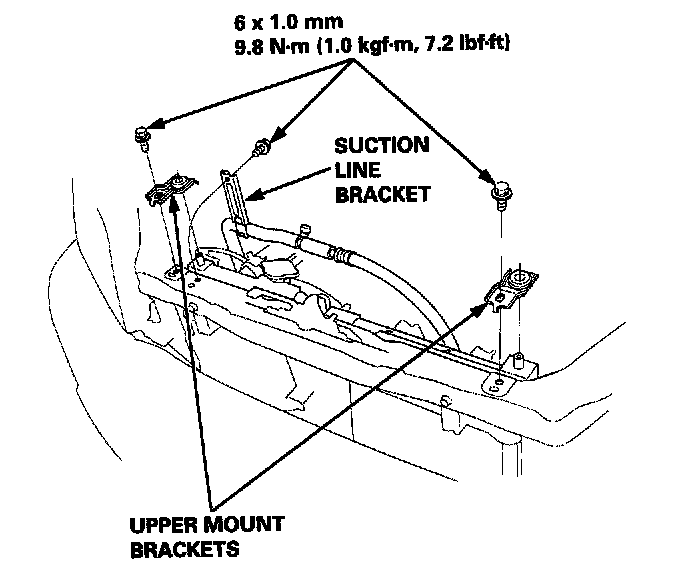 4. Remove the bolts and the suction line bracket as shown. Remove the bolts and the upper mount brackets from the radiator.
