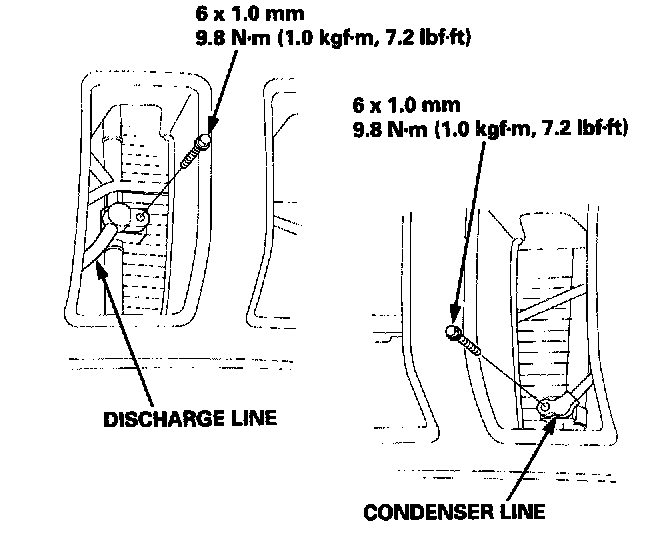 5. Remove each bolt, then disconnect the discharge and condenser lines from the condenser. Plug or cap the lines immediately after disconnecting them to avoid moisture and dust contamination.