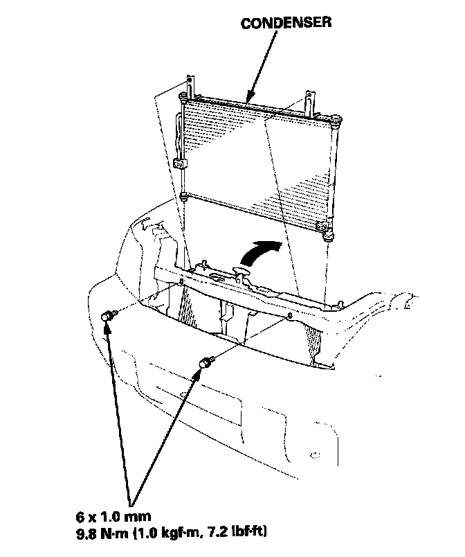 6. Remove the mounting bolts, then remove the condenser by lifting it up as shown. Be careful not to damage the radiator and condenser fins when removing the condenser.